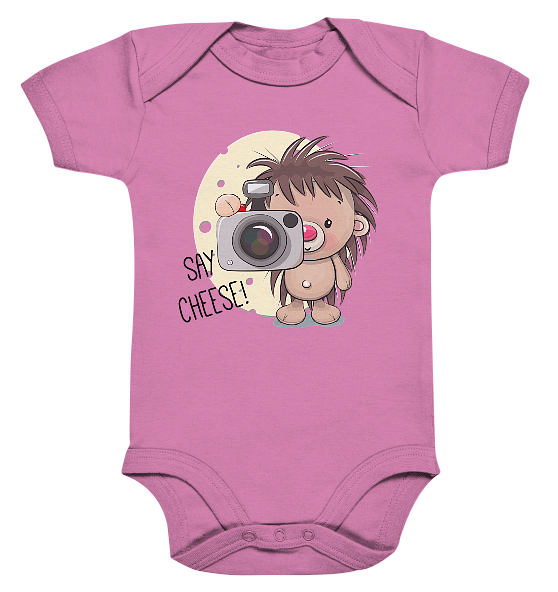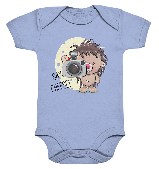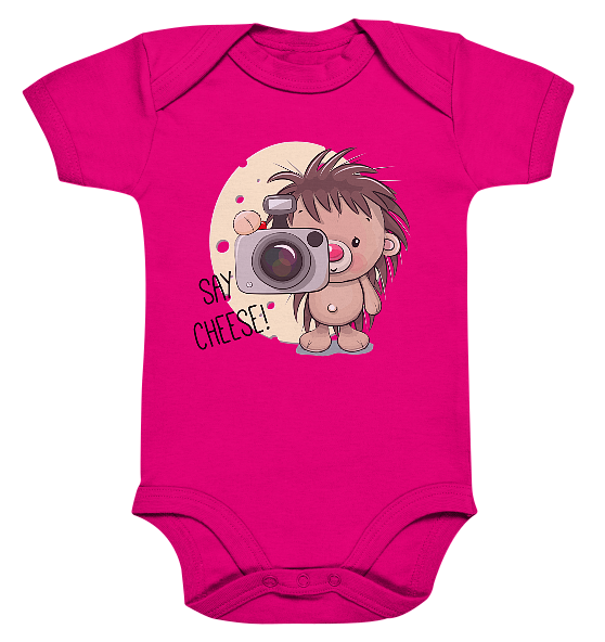 Entdecke den süßen Igel und lass uns lächeln mit unserem „Süßer Igel – Fotografie – Say Cheese“ Organic Baby Bodysuit!